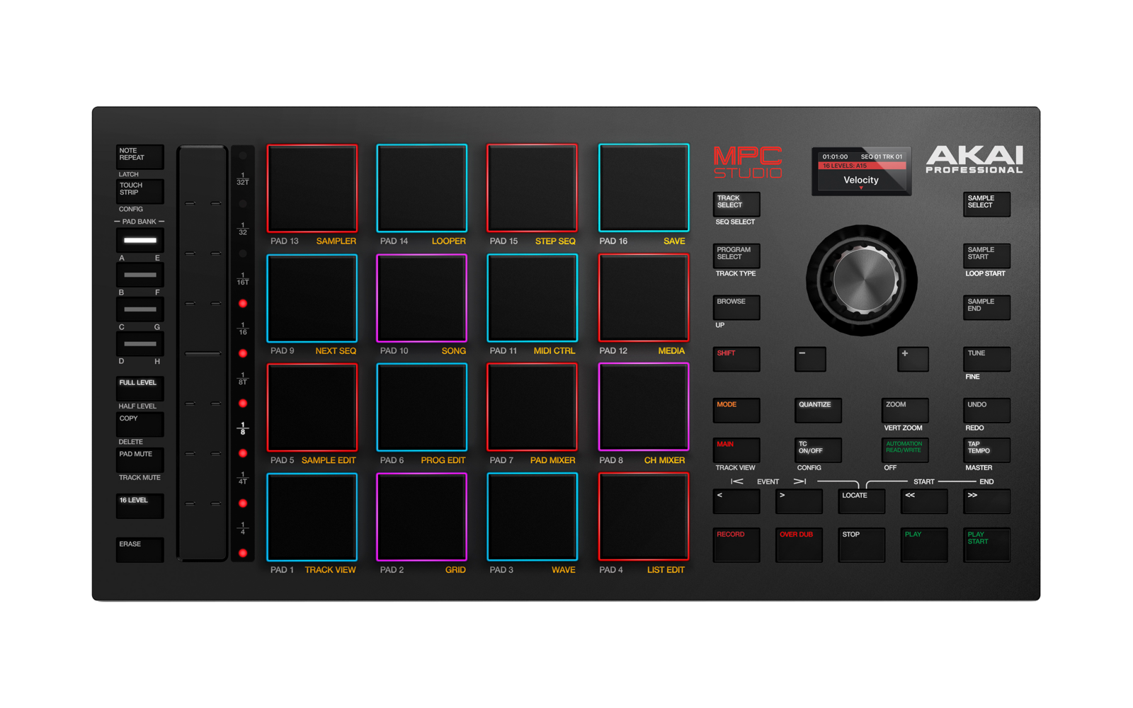 - 16 Full Size Velocity Sensitive RGB Pads ensure maximum expression and control for notes, chords, and percussion