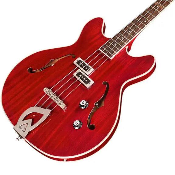 An iconic shape at an affordable price, Guild’s Starfire I Bass is a modern adaptation of the traditional Starfire Bass platform, exemplifying the features needed on a modern Hollowbody bass. Featuring a slimmed down, 2.4” body thickness, inward-shifted neck, short 30 ¾” scale length, and a 1 ½” nut width, the Starfire I Bass is a compact and accessible option for younger players, or those who want more freedom on stage. Stable tuning and easy adjustability are provided by the Tune-o-matic bass bridge, and the harp tailpiece adds a touch of Guild’s classic aesthetic, likening the bass to its upright ancestors. Guild’s own BC-1 BiCoil pickups adorn the bass, complete with hum resistant nickel covers and Alnico 5 magnet construction. Combined with the woody nature of semi-hollowbody tone and the volume and tone control, these pickups allow the player to dial in anything from modern, cutting bass tones to wooly, round, vintage tones. Pull up on the Volume Knob to reveal the push-pull vintage switch—a feature that adds presence with rolled down low frequencies, reminiscent of the parallel pickup configuration on vintage Hollowbody basses.