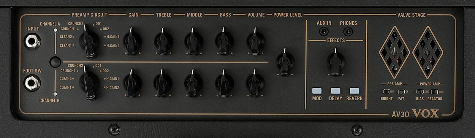 Perfect for the studio or a small club, the AV30 is a fully-featured analog amp that packs decades worth of tones into a compact package. The AV30’s unique multi-circuit analog pre-amp utilizes a 12AX7 tube to provide a full complement of clean, crunch, overdrive, and high gain tones that can be tailored to your liking via the Bright and Fat switches. These classic tones are further enhanced by a customizable, tube equipped analog power section and a unique, sealed speaker enclosure for improved resonance. Rounding out the feature set are three, analog-voiced digital effects including Chorus, Delay & Reverb. The AV30 from VOX is an incredibly versatile amplifier that is packed with pure, analog tone.